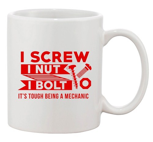 I Screw I Nut I Bolt It's Tough Being A Mechanic Dishwasher Safe Coffee Mugs. Funny Novelty Glassware, high quality ceramic coffee cups only from City Shirts.