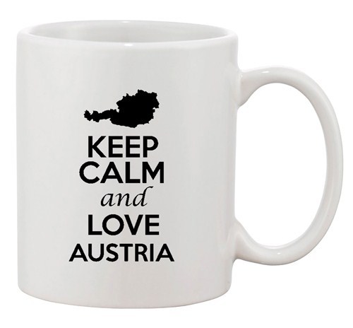 Keep Calm And Love Austria Europe Perfect Gift Dishwasher Safe Coffee Mugs. Patriotic Novelty Glassware, high quality ceramic coffee cups only from City Shirts.