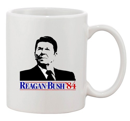 Ronald Reagan Bush '84 Election Vote Campaign Dishwasher Safe Coffee Mugs. Political Novelty Glassware, high quality ceramic coffee cups only from City Shirts.
